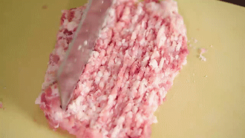 你會發現,剁好之后的肉餡,跟沒剁的肉餡有一定的區別:剁好后肉餡會很有彈性!
